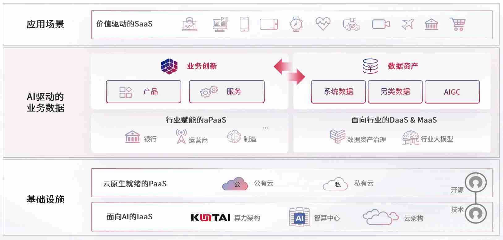 数字时代,,围绕企业数字化转型的关键要素,,伟德bv1946数码开创性的提出数云融合战略和技术体系框架,,,着力在云原生、、、数字原生、、、、AI原生和信创产业上架构产品和服务能力,,,,为处在不同数字化转型阶段的快消零售、、、汽车、、、、金融、、、医疗、、政企、、教育、、、运营商等行业客户提供泛在的敏捷IT能力和融合的数据驱动能力,,,,构建跨界融合创新的数字业务场景和新业务模式,,,,助力企业级客户建立面向未来的核心能力和竞争优势,,,,全面推动社会的数字化、、、智能化转型升级。。。