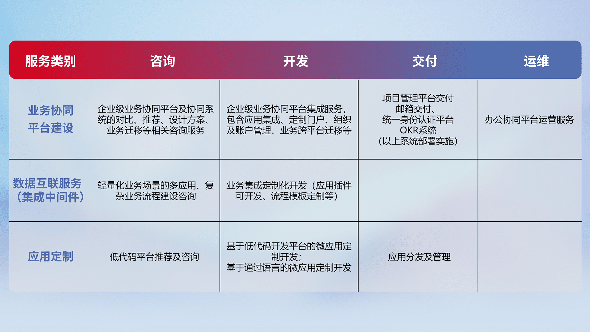 针对钉钉、、企微、、IDaas等平台级产品提供产品的规划、、方案、、、、交付、、、、定制化开发等服务,,实现如统一协同办公、、智能客户服务、、、、混合会议管理、、、、智能数据查询、、、等业务场景,,,,实现数字化转型。。